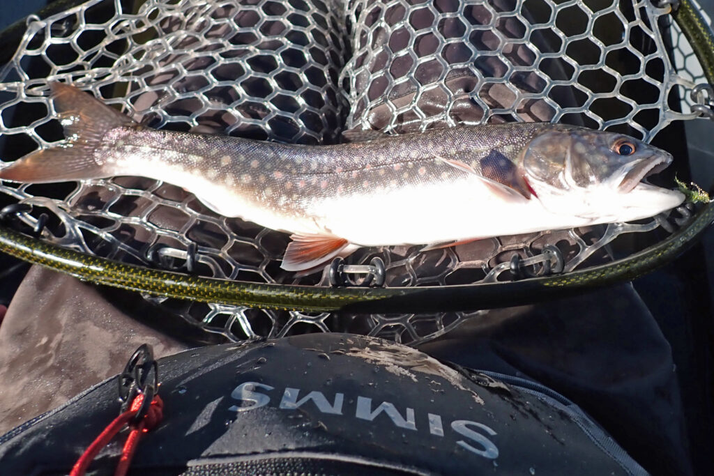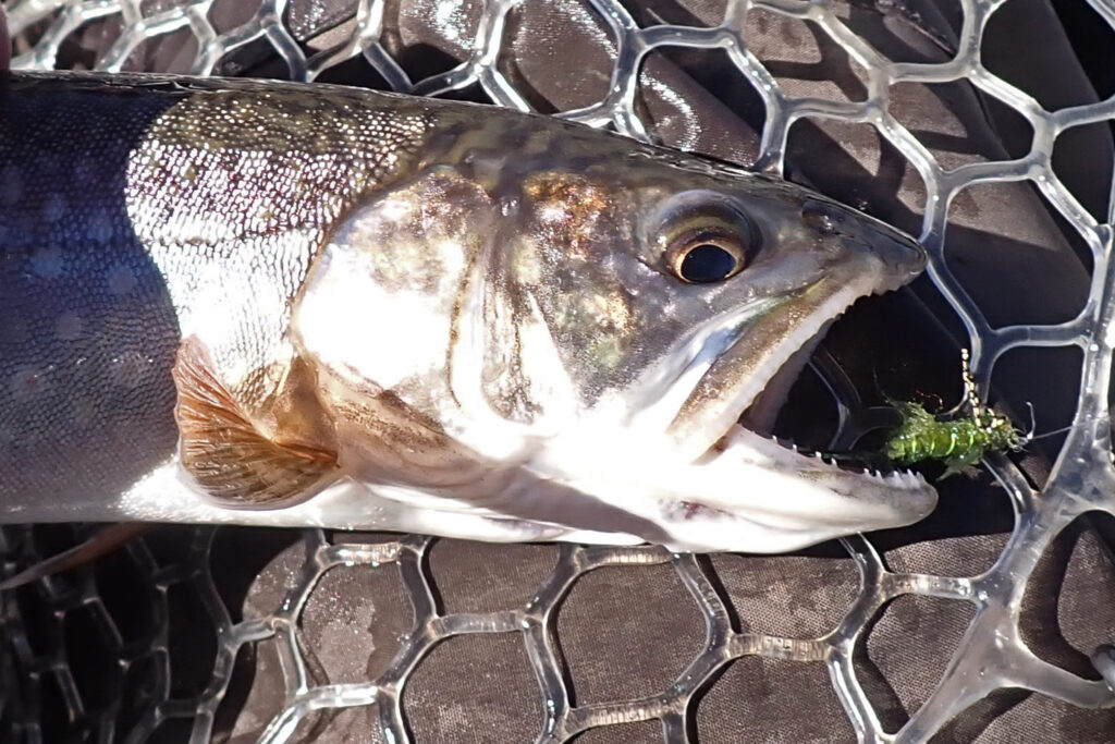 There are a variety of trout available to catch in Red Creek Reservoir. The UDOW reports there are four “trout” in the reservoir: Rainbow, Bonneville cutthroat, Splake, and Tiger. I believe we caught all four today, but I admit that the Rainbows and Cutthroats were difficult to tell apart. My personal experience is that while both sport crimson splashes on their gill covers and sides, the Cutthroats usually display their namesake crimson to orange slashes underneath their jaws, and their dark spotting pattern is usually sparse at their head and progressively more dense towards their tail. I apologize for torturing my readers with another lesson on trout taxonomy, but my intention was to give you some perspective about the confusion this fishery creates. Rather than stocking the usual Rainbow trout (scientific name: Oncorhynchus mykiss) and Brown trout (scientific name: Salmo trutta), UDOW began stocking exotic trout like Bonneville cutthroat (scientific name: Oncorhynchus clarkii utah) and hybrid trout like Splake (hybrid Salelinus namaycush, i.e., Lake trout, × Salvelinus fontinalis, i.e., Brook trout) and Tiger (hybrid Salmo trutta, i.e., Brown trout, × Salvelinus fontinalis, i.e., Brook trout). The hatchery hybrid process for Splake and Tiger pretty much renders them sterile, so they don’t compete with the Rainbows for spawning habitat. To add more confusion to this science soup, Lake and Brook trout are classified as “charr” (in the genus Salvelinus), which sport light speckles on darker background whereas “trout” (in the genera Oncorthyncus and Salmo) which usually carry dark spots on lighter coloring. The biology that puts Rainbows and Cutthroats in the same taxonomic family (Salmonidae / Salmoninae / Oncorhynchini / Oncorthyncus) allows them to naturally cross breed creating another natural hybrid affectionately called a Cutt-Bow trout. I suspect there are some Cutt-Bows somewhere in that 70 acre reservoir.